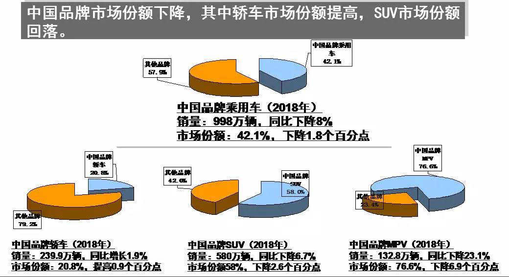 中国品牌乘用车市场份额同比下降。2018年,中国品牌乘用车共销售998万辆,同比下降8%,占乘用车销售总量的42.1%,比上年同期下降1.8个百分点;其中:中国品牌轿车销售239.9万辆,同比增长1.9%,占轿车销售总量的20.8%,比上年同期提升0.9个百分点;中国品牌SUV销售580万辆,同比下降6.7%,占SUV销售总量的58%,比上年同期下降2.6个百分点;中国品牌MPV销售132.8万辆,同比下降23.1%,占MPV销售总量的76.6%,比上年同期下降6.9个百分点。