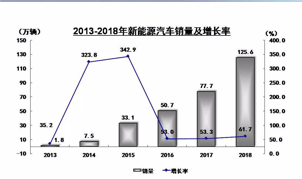 2018年,新能源汽车产销分别完成127万辆和125.6万辆,比上年同期分别增长59.9%和61.7%。其中纯电动汽车产销分别完成98.6万辆和98.4万辆,比上年同期分别增长47.9%和50.8%;插电式混合动力汽车产销分别完成28.3万辆和27.1万辆,比上年同期分别增长122%和118%;燃料电池汽车产销均完成1527辆。