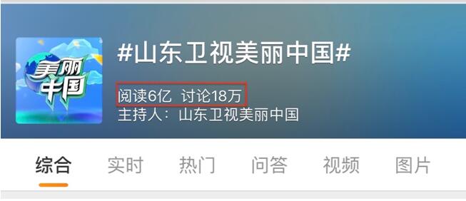 《美丽中国我爱你》的歌词将生态文明理念和对祖国的热爱结合在一起,旋律朗朗上口。MV上线仅10小时秒拍播放量就达到了1356万,众多微博KOL自发安利,网友们听后纷纷表示“我们的每一次选择,都是为了让祖国更美丽!”“为大山东打call”。截至今日,MV播放量已突破1418万。同时,伴随推广曲的热播,节目主话题#山东卫视美丽中国#也引发全网关注,微博热搜话题榜在榜时间十余小时,话题阅读量飙升至6亿! “这个节目好棒,为过去没意识过改变生活方式的自己感到惭愧”“看这个节目涨知识了,我也要助力环保!”“绿色出行 健康生活 我们的选择就是地球的模样!”