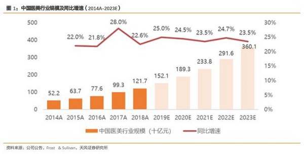 而从需求端看,根据Frost & Sullivan的研究报告,2014-2018年中国医美行业规模复合增速为23.6%,预计2023年医美行业规模有望达到3601亿元,达到2018年的三倍,年复合增速达24.2%;2017年我国已经是全球第二大医美服务市场,且有望在2021年成为全球第一。