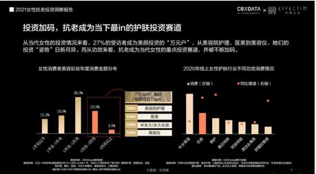 CBNData《2021女性抗老投资洞察报告》中调研发现,27%的受访者成为美颜投资的“万元户”,而就功效来看,抗老成为当下女性的,投资赛道,并被不断加码。