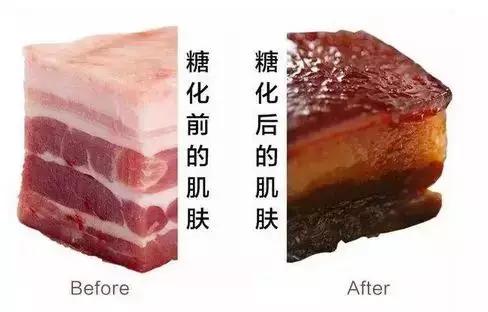 所谓“糖化”,是指我们身体内的蛋白质和通过饮食摄入的“糖”结合,导致蛋白质质变,生成糖化终产物(AGEs), 从而发黄变脆的现象。简而言之,糖化的过程会令肌肤失去弹性、产生细纹干纹、色素沉淀变得暗黄,并产生各种痘痘,斑点。研究显示:平均来说,血糖高的人的外观看上去都比实际要老5岁。