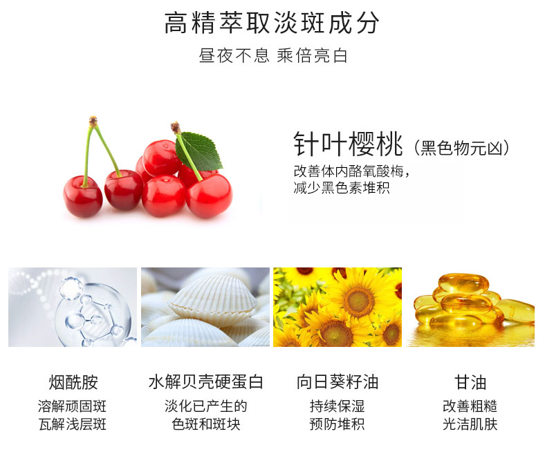 、安全的淡斑产品,首先必须要有纯自然植物提取物,这样才能安全淡斑不反弹。法国天芮淡斑精华液有效成分均萃取自植物精华。针叶樱桃提取物是黑色素瓦解神器,有效改善体内络氨酸梅,减少黑色素堆积;特有的水解贝壳硬蛋白,可以淡化已产生的黑色素和斑块;向日葵籽油持续保湿,预防堆积。安全的成分才能铸就、安全的产品。