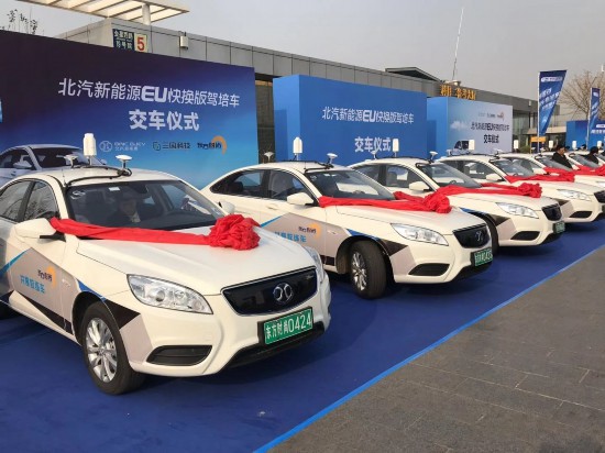 会上,东方时尚、三国科技、北汽新能源举行EU快换版驾培车交车仪式。现场,部分嘉宾试乘试驾了电动教练车、考试车。