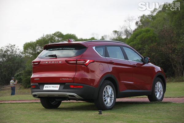 车身侧面腰线设计刚劲有力,同时营造出俯冲的车身姿态。X70S车身尺寸长宽高分别为4750/1910/1710mm,轴距为2745mm,定位于中型SUV。车尾设计与X70基本保持一致,其风格更较为简洁,尾灯之间“JETOUR”Logo表明身份。下方黑色包围加入银色护板,双边双出镀铬排气装饰提升运动感。造型细长的尾灯组内部融入了LED光源,提升了夜间的视觉效果与辨识度。制动时横置四点刹车灯也十分醒目。