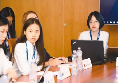 今年5月,黄飘莹(中)作为经济委员会的主席参加了中欧青年,论坛,主持了围绕中国和16个中东欧国家的“模拟16+1”中欧,论坛。图为她在主持会场。黄飘莹供图。