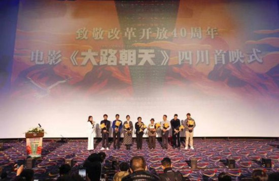 12月24日,电影《大路朝天》四川首映式在"峨影˙1958"电影公园隆重举行。四川省人民政府、四川省委宣传部、四川省交通运输厅、四川省国资委、四川省总工会、共青团四川省委、四川省妇女联合会、峨眉电影集团、四川省能源投资集团有限责任公司、四川省交通投资集团有限责任公司、四川公路桥梁建设集团有限公司等单位的领导嘉宾莅临现场。四川省委宣传部副部长、四川电影局局长周青和出品方代表峨眉电影集团党委书记、董事长韩梅分别上台致辞。同时,影片主创人员苗月、陈瑾、郭晓峰、白微、巴登西绕、张政勇、孙艺杨、孙敏也都现身,与观众们分享了创作故事及初衷。