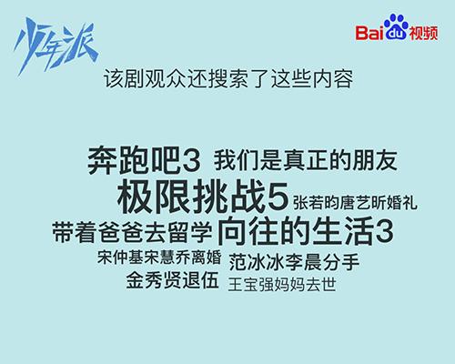 百度视频大数据分析显示,《少年派》的观众还喜欢搜索观看《带着爸爸去留学》这种同类型剧,以及《极限挑战5》、《奔跑吧3》等同期热播的综艺节目,同时还关注张若昀唐艺昕婚礼、宋仲基宋慧乔离婚、范冰冰李晨分手等娱乐圈八卦。