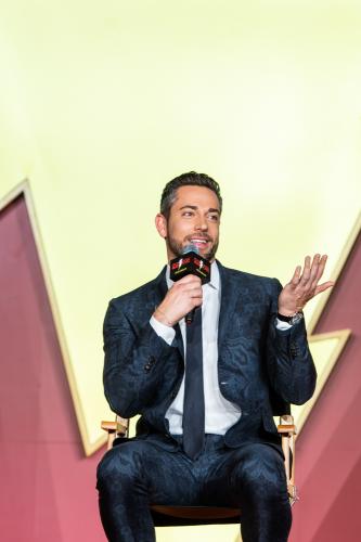 发布会前的红毯上,超级英雄沙赞的扮演者扎克瑞·莱维身穿西装露面,引发现场粉丝尖叫。在扎克瑞看来,沙赞和其他DC英雄,的不同点是非常搞笑,以及意外获得的超能力的过程。