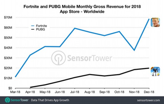 根据第三方调查机构Sensor Tower 报导指出,Epic Games 旗下跨平台游戏《堡垒之夜》在2018 年内,得力于在行动装置上推出iOS 版本,据Sensor Tower Store Intelligence推估,该作品在3月份登上App Store后营收突破1000万美元,并且在12 月时提升至将近6900万美元,该月份同时也是目前为止营收,的一个月份。