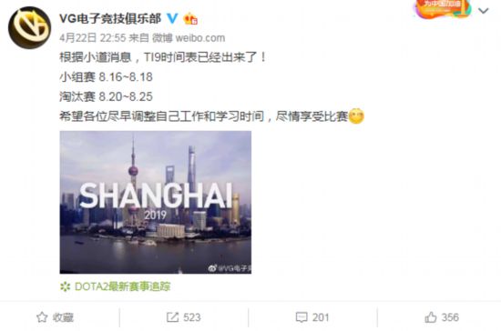 VG电子竞技俱乐部发布微博,称根据小道消息,TI9时间表已经出来了。