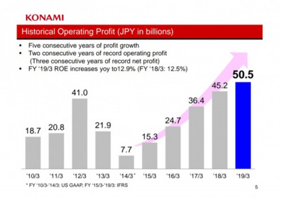 随着2018财年的结束,各大公司也开始陆续公布自己的上财年财报。近日科乐美也正式公布了去年成绩,财报显示上财年全年营业额为2625亿日元,营业利润达到505亿日元创历史新高,同比去年提升了11.8%,同时这也是科乐美继2014年暴跌之后的连续第五年增长。