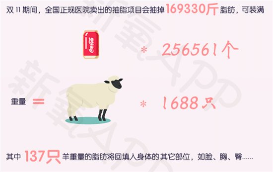 根据新氧大数据,双11期间,全国正规医院卖出的抽脂项目可抽掉169330斤脂肪,可装满256561个易拉罐,重量相当于1688只羊。