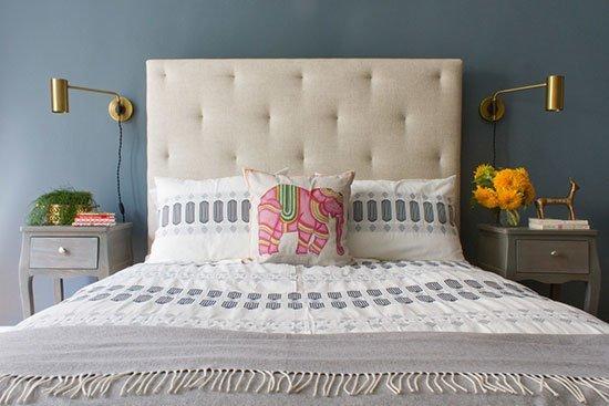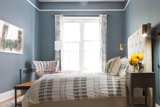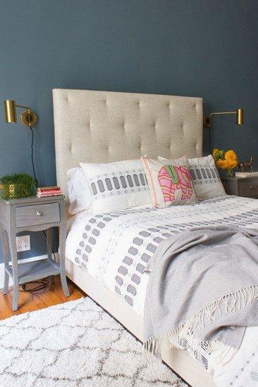 卧室的色调与客厅形成了鲜明对照,深蓝色的墙面显得十分静谧,易于入眠,白色的软包床头显得柔和、舒适。