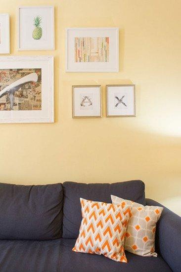两只带有橙色花纹的抱枕与深色沙发形成对照,同时与橙色茶几相呼应,挑出色彩亮点。沙发背景墙上多幅不同大小的装饰画排列组合,让墙面丰富多彩。