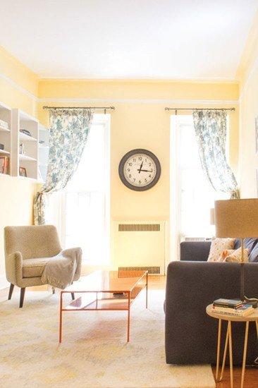 鹅黄色的墙面让客厅有了温暖的色调,地毯是地面上不可或缺的一部分,深蓝色沙发与橙色茶几形成色彩的碰撞,有限的客厅空间拥有着无限的活力。