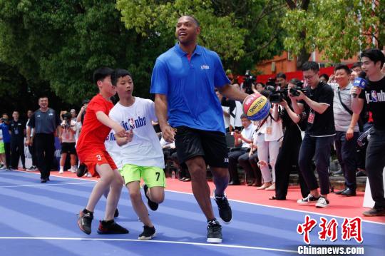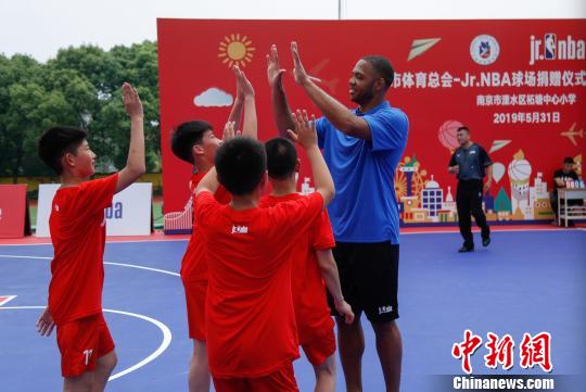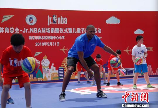 中新网南京5月31日电 (张陈朱晓颖)31日,休斯顿火箭队球员埃里克·戈登到访江苏省南京市柘塘中心小学,出席了由NBA中国、上海市体育总会举办的Jr.NBA篮球场捐赠仪式。