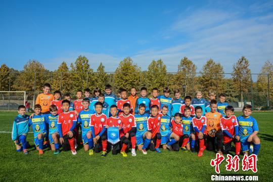 天津足球青训代表团小球员与塞尔维亚足球小将赛后合影。 刘晨 摄