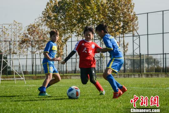 天津代表团小球员与塞尔维亚足球小将切磋。 刘晨 摄