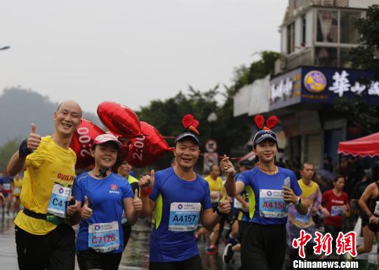 中新网桂林11月11日电(欧惠兰)2018桂林国际马拉松赛11月11日鸣枪起跑,比赛期间阴雨连绵,来自全球31个国家和地区的25000多名参赛选手在雨中尽情奔跑,用一场马拉松来体验烟雨桂林“水墨山水画”的美景。最终肯尼亚选手包揽了马拉松男女组,。