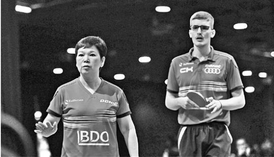 已经55岁的倪夏莲(左)参加在布达佩斯举办的2019世界乒乓球锦标赛。