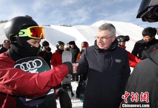 资料图:1月29日,国际奥委会主席巴赫一行在河北省张家口市和北京市延庆区考察2022年北京,筹办进展。图为巴赫在张家口考察2022冬奥赛场建设时与在雪场训练的运动员碰拳交流。北京冬奥组委供图