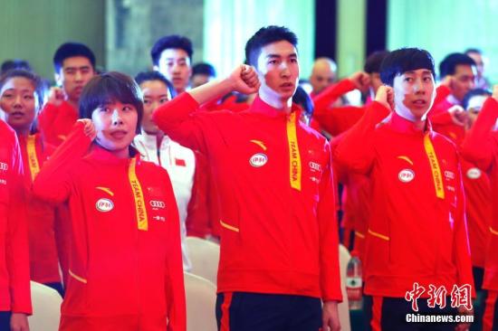 5月10日,北京,,1000天,冰雪项目国家集训队誓师动员大会在北京首钢园区举行。图为短道速滑队武大靖(中)宣誓。中新社记者 富田 摄