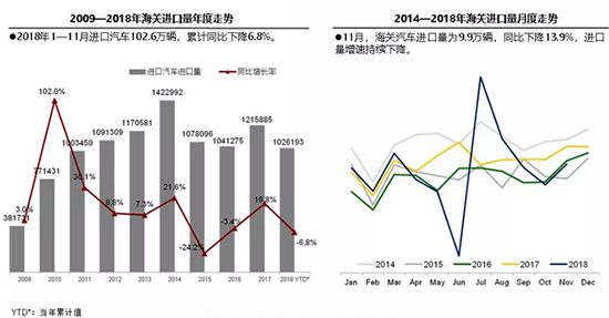 2018年11月,中国汽车进口量为9.9万辆,同比下降13.9%;销售7.7万辆,同比下降6%。国机汽车表示,受实体经济经营困难、制造业增长结构性压力和金融去杠杆的压力影响,汽车消费受到挤压,再加上中美贸易摩擦等因素影响终端消费,导致进口车市场持续低迷。