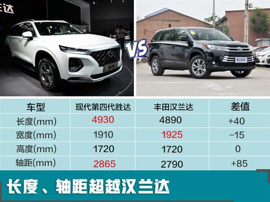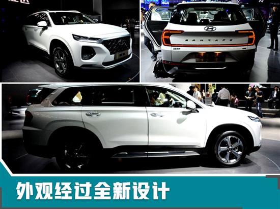 第四代胜达外观经过全新设计,前脸采用多边形进气格栅,两侧为分体式大灯组。侧面来看车身的整体线条十分硬朗,腰线从前翼子板一直延伸到尾部。尾灯组为当今流行的贯穿式设计,排气为双边共两出式布局。车身的长宽高分别为4930×1910×1720mm,轴距加长到2865mm,尺寸全面超越了汉兰达,并推出六座和七座两个版本。