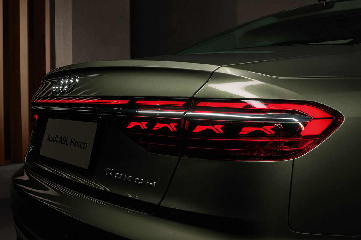 车尾部分,新车采用奥迪OLED尾灯,搭配全新设计的下包围与“Horch”标识,实现了极高的车身辨识度。此外,新车还新增橡木绿(Oakgrun)、雨云灰(Nimbusgrau)两款专属外观颜色。同时,新车将提供可采用三种配色方案的双色车身设计。