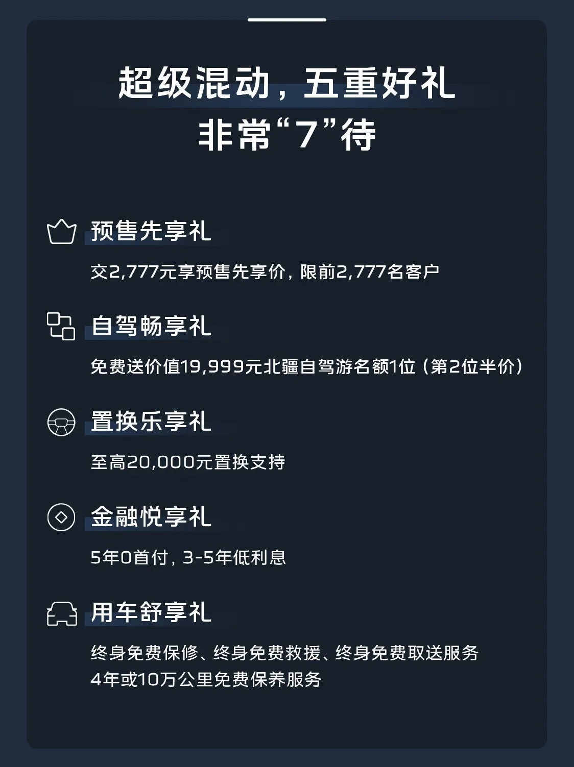 预授权益分别为:1、预售先享礼:9月30日前,通过红旗智联APP或小程序交2,777元订金抵56,000元购车款,,前2,777名用户;2、自驾畅享礼:8月30日前,下订且购车的车主可免费享价值19,999元的北疆自驾游活动,每个车主限1个名额(第2个半价);3、金融悦享礼:5年,,3-5年低利息;4、置换乐享礼:至高20,000元置换支持;5、用车舒享礼:终身免费保修、终身免费救援、终身免费取送服务;4年或10万公里免费保养服务。