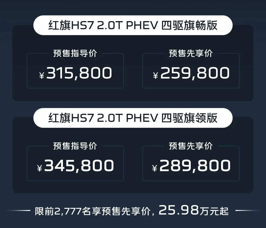 红旗HS7 PHEV正式开启预售,提供2.0T 四驱旗畅版、2.0T 四驱旗领版共两款车型,预售价为31.58-34.58万元。官方预售权益下,预售先享价为25.98-28.98万元,预售现场同时举行 2024 中国之路官方指定用车启动仪式,红旗全系产品也将成为中国之路的官方指定用车。