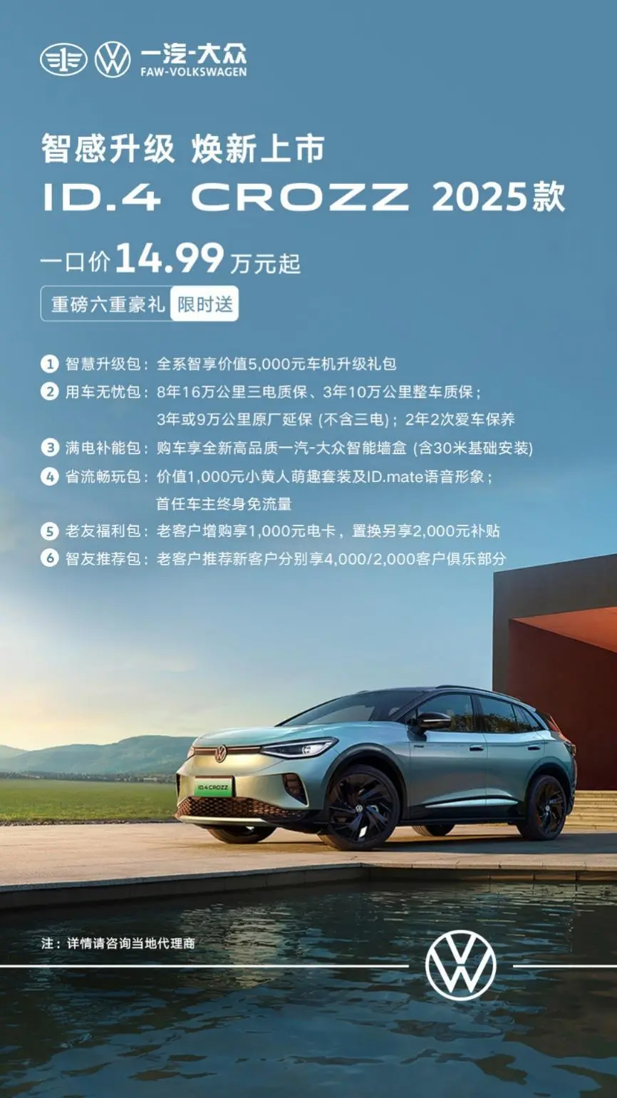 一汽-大众ID.4 CROZZ 2025款正式上市,ID. 纯享版一口价14.99万元,长续航PURE+版一口价18.59万元。同时,购车可享受重磅六重豪礼。此次焕新升级,ID.4 CROZZ 2025款在内外饰设计、智能座舱、智能驾驶辅助、动力性能及舒适配置上实现了五大维度的全面升级,为消费者带来全新的驾乘体验。