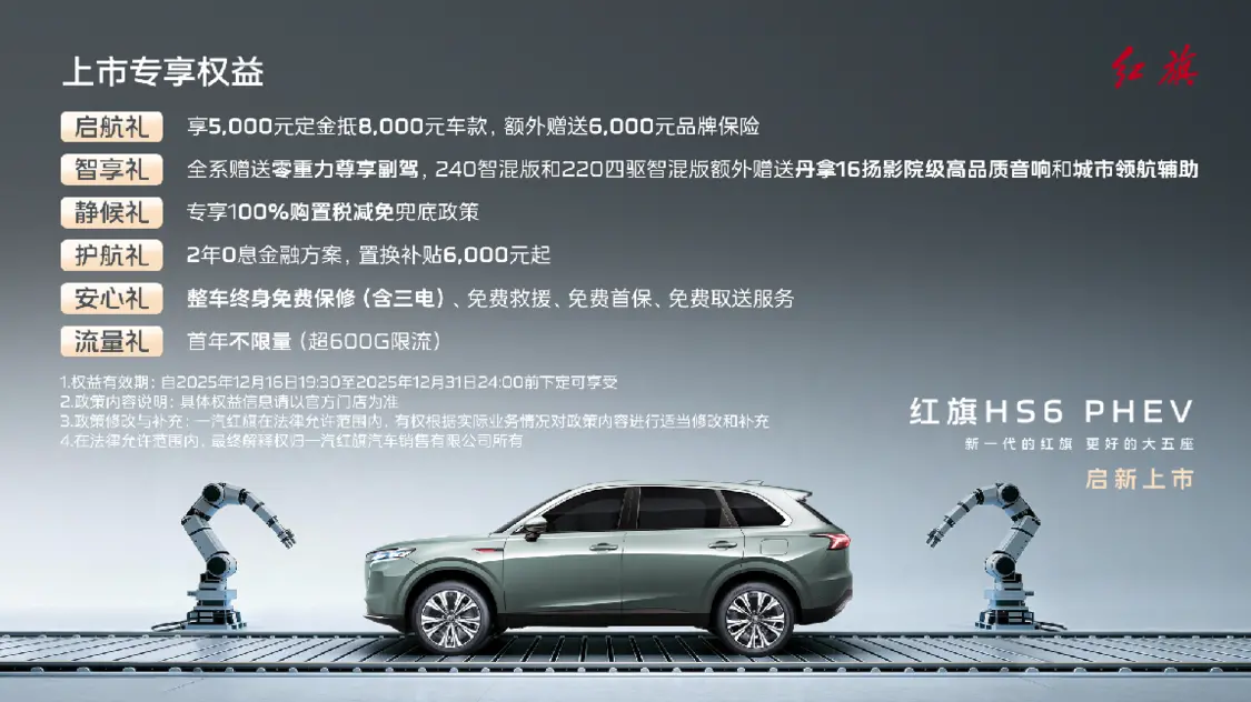 一汽红旗宣布全新一代大五座旗舰SUV——红旗HS6 PHEV正式上市。新车共推出三款配置车型:145智混版、240智混版和220四驱智混版,售价区间为17.88万—22.88万元。作为红旗全新产品周期的首款插电混动SUV,HS6 PHEV以“更好的大五座”为承诺,直面强手如云的中大型SUV市场。