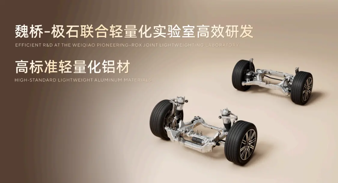 极石ADAMAS作为、全地形豪华SUV,在承载式车身的新能源SUV中拥有突出越野硬件和性能指标,新车采用全铝底盘,包括前双叉臂/后H臂多连杆独立悬架和威巴克底盘衬套,可更好的应对颠簸冲击,提供更好的减震舒适性;
