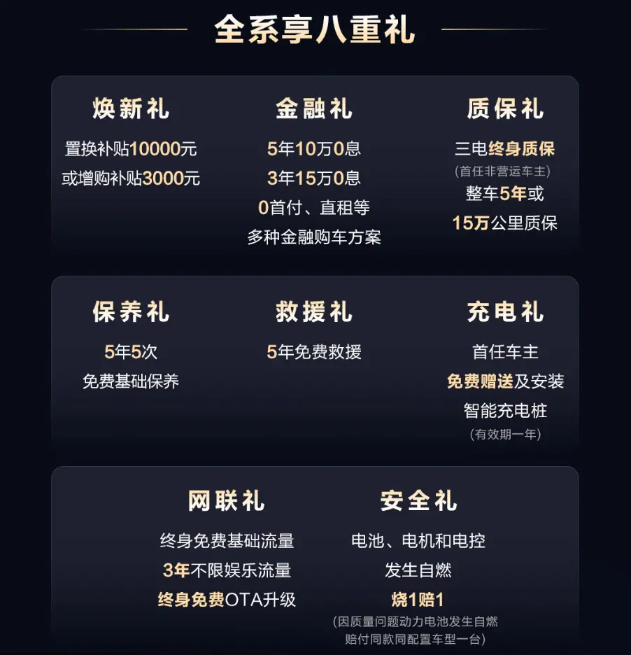 第八重,安全礼:电池、电机和电控发生自燃,烧1赔1(因质量问题动力电池发生自燃赔付同款同配置车型一台)。