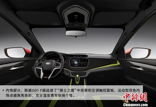 动于型,精于内。SWM斯威G01 F版采用黑色密集型翼展式运动前格栅,点缀以“F”形运动装饰和标配大包围及尾翼设计,带来强劲视觉冲击力。大胆双色车身、黑色车顶搭配动感十足,双边共两出抛光运动排气尾喉等运动套件吸引眼球,兼备原有“骑士之魂”设计元素,营造出轿跑级SUV的运动氛围,将青年人的张扬个性充分展现。
