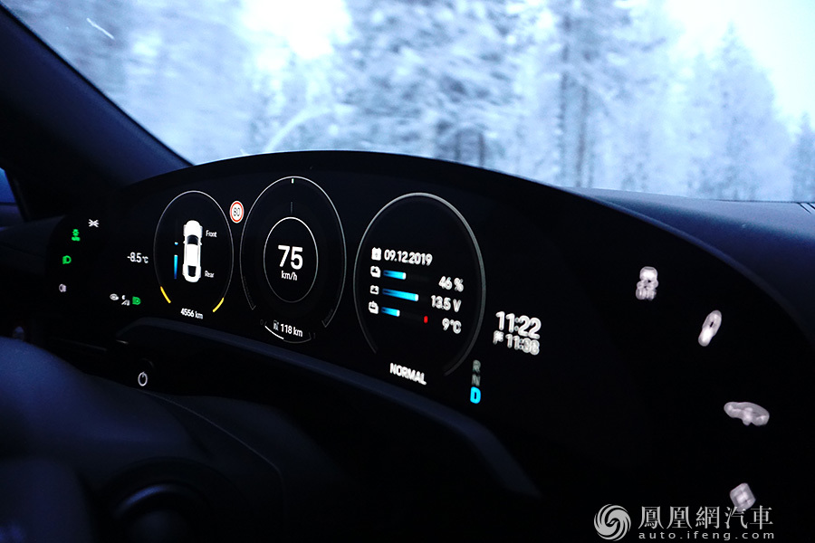 虽然是早上9点多出发,但位于北极圈以北180公里的Levi依然是漆黑一片,灯光照亮之初全是白茫茫一片,尤其森林中的路面,仅有模糊的车辙,让初次上手的我们格外小心、谨慎,轻轻试探Tancan 4S的加速踏板,普通模式下力度、响应都很好掌握,从脚感上判断接近保时捷的燃油车型。由于电动机动力输出“直给”的特点,加速踏板的调校比燃油车更要精细,才能给驾驶者足够的操控平台,太迟钝或太灵敏都不行。