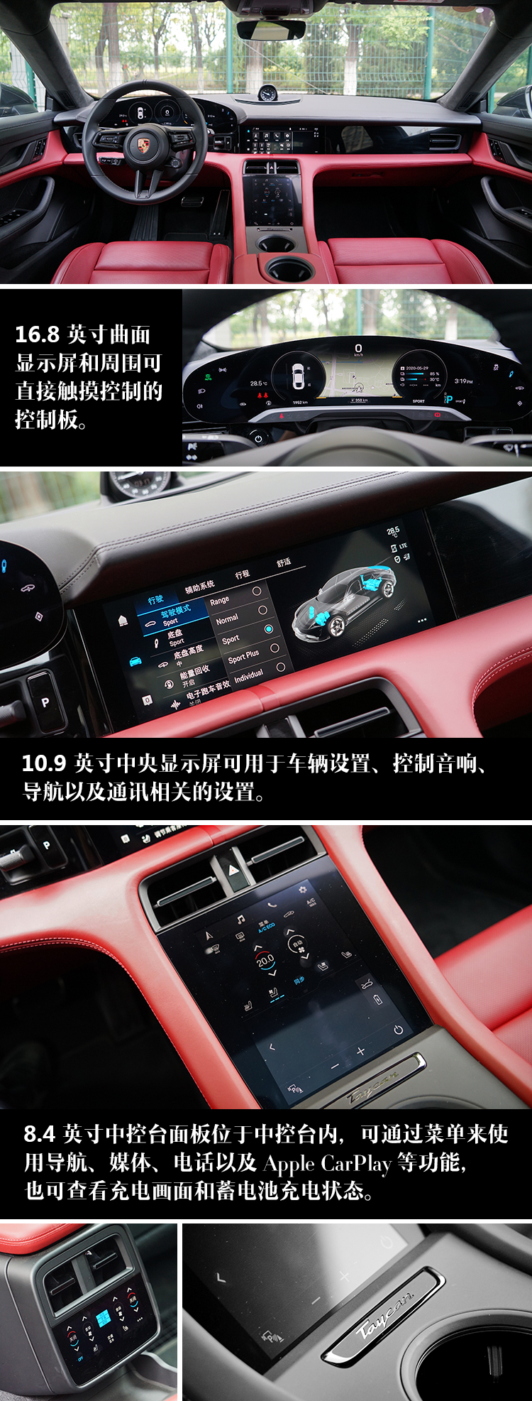 其他一些数据:保时捷Taycan的蓄电池基于800V电压技术,而非常见的400V技术,这意味着功率更高、重量更轻(因为电缆尺寸有缩减)和更短的充电时间;保时捷能量回收管理系统(PRM)最多可回收90%的制动能量,理论上从时速200km/h到刹停所回收的电能可为车辆增加4km续航里程;自适应后扰流板可在90km/h、160km/h以及200km/h时速时分三级打开。