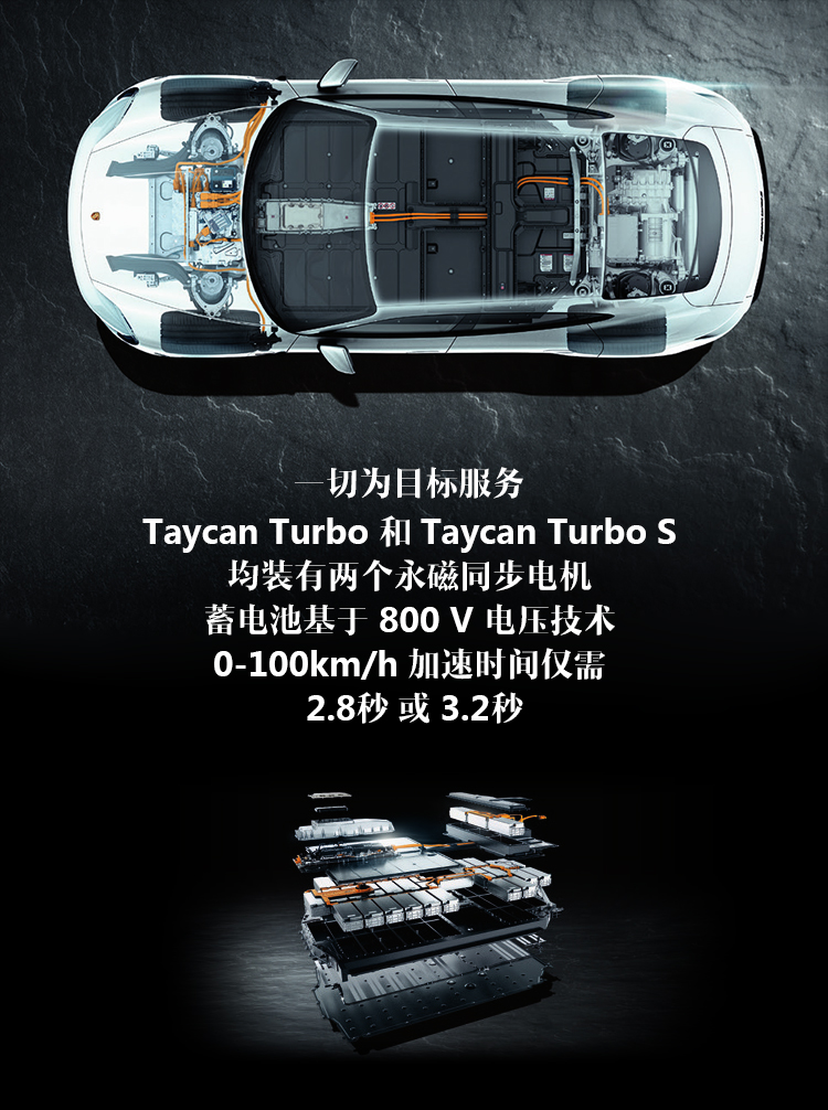 在88.8万元的保时捷Taycan上,标配后置单电机以及79.2kWh的电池组,启用起步控制系统时的,超级增压功率可达300kW,0-100km/h加速时间为5.4秒,NEDC,续航里程414公里。而在这辆更出色的保时捷Taycan Turbo上则配有前后双电机以及93.4kWh的电池组,启用起步控制系统时的,超级增压功率可达500kW,0-100km/h加速时间为3.2秒,NEDC,续航里程462公里。