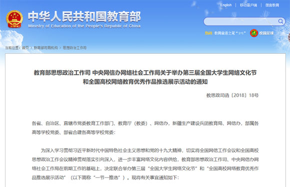 人民网北京7月13日电(李依环 时宝韫)7月12日至12月31日,由教育部思想政治工作司和,网信办网络社会工作局联合举办的第三届“全国大学生网络文化节”和“全国高校网络教育优秀作品推选展示活动”将陆续在全国高校开展。该活动主题为“传播正能量、弘扬主旋律,争做校园好网民”,旨在进一步推动全国网信工作会议和全国高校思想政治工作会议精神落地生根,丰富网络文化内容供给。