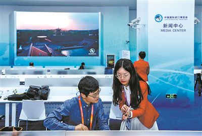 11月4日,首届中国国际进口博览会进入1天,。来自复旦大学、上海交通大学等34所上海高校的5200多名大学生志愿者,成为进博会志愿者队伍的主力军。图为进博会新闻,的东华大学志愿者(右)在为记者解答问题。 张劲松 摄