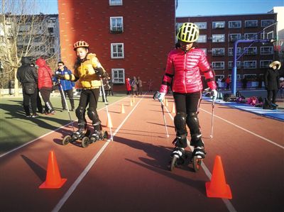 为解决冰场有限的难题,史家分校引入了旱地冰雪训练方式,学生在普通场地就可以练习冰雪运动项目,这也是众多冰雪运动特色学校的一项通行做法。据该校一名老师介绍,学生经过旱地冰雪运动项目的练习后,将来到真正的冰雪场地进行运动也能很快上手。