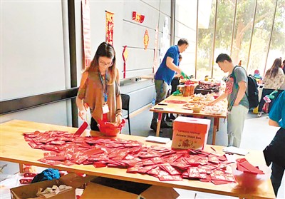 春节那天,学校为中国留学生安排了新春活动,准备了很多装有金币巧克力的红包,派送的小饼干里还夹着新年祝福;不经意间,我惊喜地发现,墙面上还藏了许多谜语。对于过年还要上课的我们来说,这已是,的“年味”了。