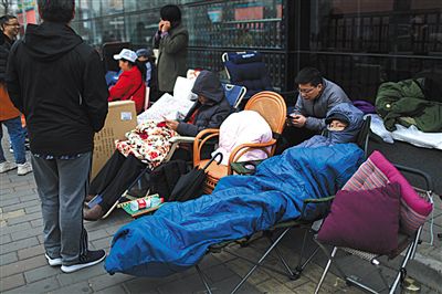 27日,昌平南邵,幼儿园门外,报名家长躺在路边排队。