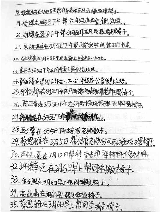 “3月5日好人好事本试行第,,大家都很兴奋,争着要做好事,连老师办公室倒垃圾的活也被他们承包了,下午快放学时,有几个同学遗憾地和我说,好事全被别人做了,自己没有好事可以做了。”403班班主任吕夏晶笑着说道。