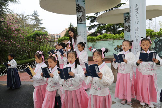 4月23日,青岛西海岸新区香江路第一小学举办世界读书日活动。活动包括:咏春(咏春诗)、诵春(诵春文)、品春(吃春卷)、饮春(饮春茶)等环节。来自全校千余名小学生诵读国学经典,让学生们领略传统文化的魅力。