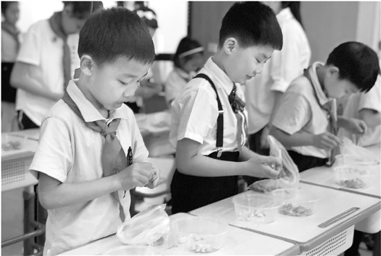 二(3)班学生庄千誉的爸爸对此也有同感。庄爸爸告诉记者,一个月下来,只要家里吃毛豆,几乎全是小庄剥的,每次爸爸买来2斤毛豆,小庄一个人就可以剥完一大半。“一开始他剥得很费劲,咬着牙才能抠出一颗豆子。这一个月家里买了6次毛豆,经过这几次的锻炼,现在小庄剥豆子越来越轻松,手法也越来越灵巧。”