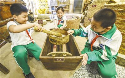 河北省香河县城内第二小学的学生参观农家博物馆,体验筛面粉所用的箩床等工具。李晓果/摄(新华社发)