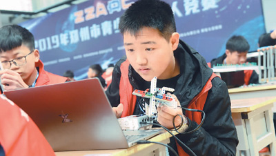 3月31日,2019年郑州市青少年机器人竞赛,将线上创意编程比赛纳入竞赛中。图为选手在比赛前编程。 |